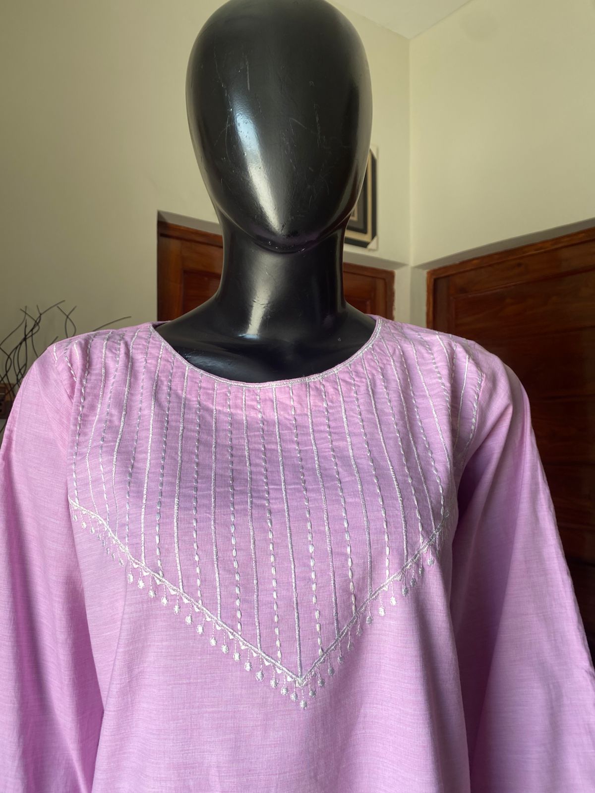 Round neckline with white vertical thread embroidery forming a v shape pattern on the chest .long sleeves with embroided at the cuffs in a slightly darker shade .straight fit with a simple and elegant silhouetle .
